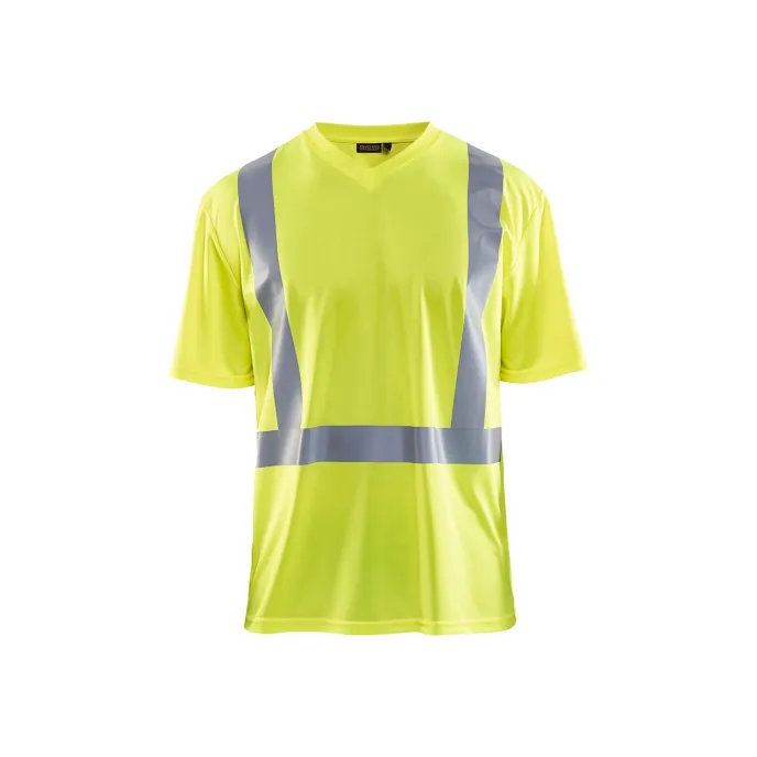 T-Shirt da lavoro alta visibilità, firmata Blaklader, scollo a V, tessuto traspirante, assorbe l'umidità e protegge dai raggi UV,  il tessuto a maglia leggero garantisce un'ottima ventilazione, bande riflettenti termoadesive, Certificazioni: EN ISO 20471 classe 1 e EN 13758-2 UPF 40+.