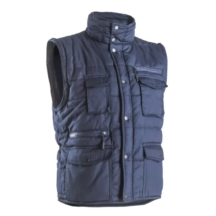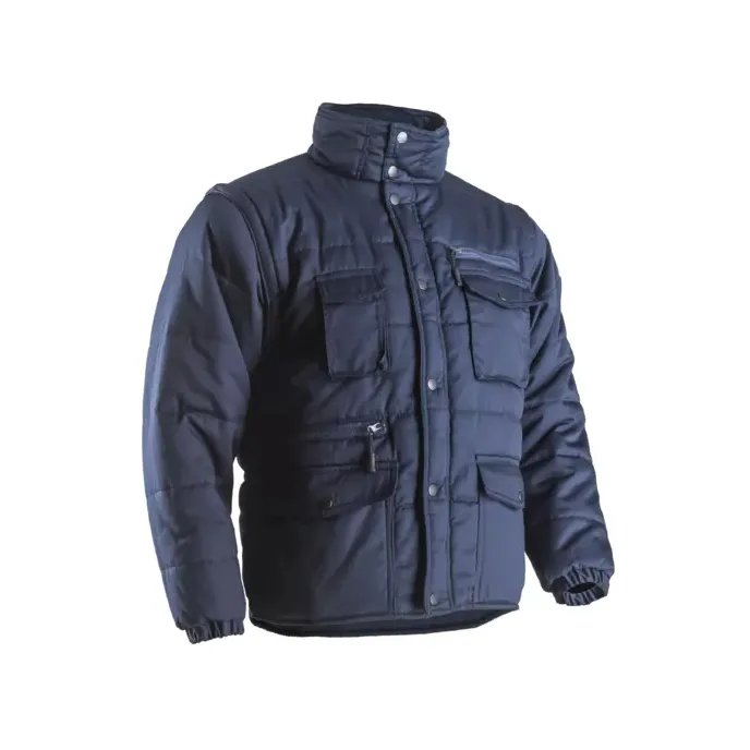 Il giubbotto Polena Sleeve 2/1  5PSLB di Coverguard è un capo d'abbigliamento professionale estremamente versatile e termico, certificato secondo la normativa EN14058 per la protezione contro il freddo. Realizzato con un tessuto esterno in poliestere e cotone da 245g/m2 e una spessa imbottitura in poliestere da 190g/m2, il capo assicura un isolamento efficace rendendolo ideale per settori come l'edilizia, la logistica e le infrastrutture. La caratteristica distintiva del prodotto è rappresentata dalle maniche staccabili tramite cerniera, che permettono di trasformare rapidamente il giubbotto in un pratico gilet a seconda delle esigenze climatiche o lavorative. Il design include un collo alto, una chiusura centrale con zip protetta da patta con bottoni a pressione e polsini elasticizzati che garantiscono una vestibilità sicura e confortevole. La funzionalità è ulteriormente accresciuta da una configurazione multitasche pensata per una gestione pratica degli oggetti personali e da una fascia in vita laterale elasticizzata che ottimizza l'aderenza al corpo. Questo giubbotto rappresenta dunque una soluzione flessibile e robusta per chi opera in ambienti esterni e necessita di un indumento capace di adattarsi a diverse condizioni operative