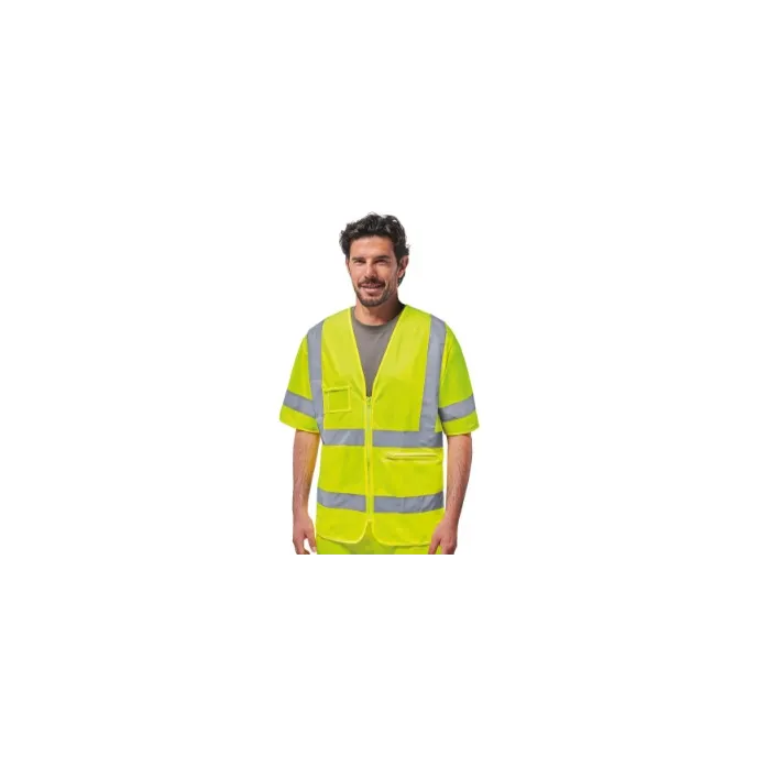 Gilet da lavoro HV016 , Firmato logica, composto 100% poliestere, manica corta, con portabadge e chiusura con zip.