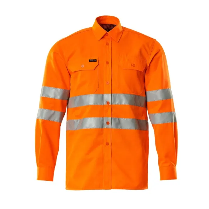 Camicia da lavoro alta visibilità Jona firmata Mascot, dotata di vestibilità ampia e comoda, maniche e lati rinforzati con doppia cucitura, chiusura con bottoni, collo rigido, tasche sul petto con pattina, porta-penne, soffietto sulla schiena con ventilazione, ha aperture rinforzate per ventilazione maniche, polsino con bottone. Nomativa: EN ISO 20471.
