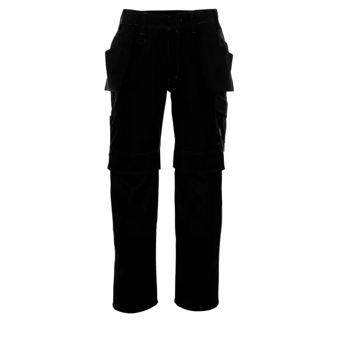 Pantaloni da lavoro multitasche Springfield firmati Mascot, dotati di cuciture triple su gambe e cavallo, vita bassa con cintura sagomata, gamba con design ergonomico, passanti della cintura, anello a D, patta con cerniera, tasche esterne in poliestere con rinforzi e taschine addizionali, tasche anteriori, tasche posteriori con rinforzi, passante per martello regolabile, tasca laterale con pattina e bottoni automatici a scomparsa, tasca porta-metro rinforzata, tasca con porta-penne, tasche ginocchiera regolabili in poliestere con pattina e apertura in alto, cuciture di contrasto e profili riflettenti.