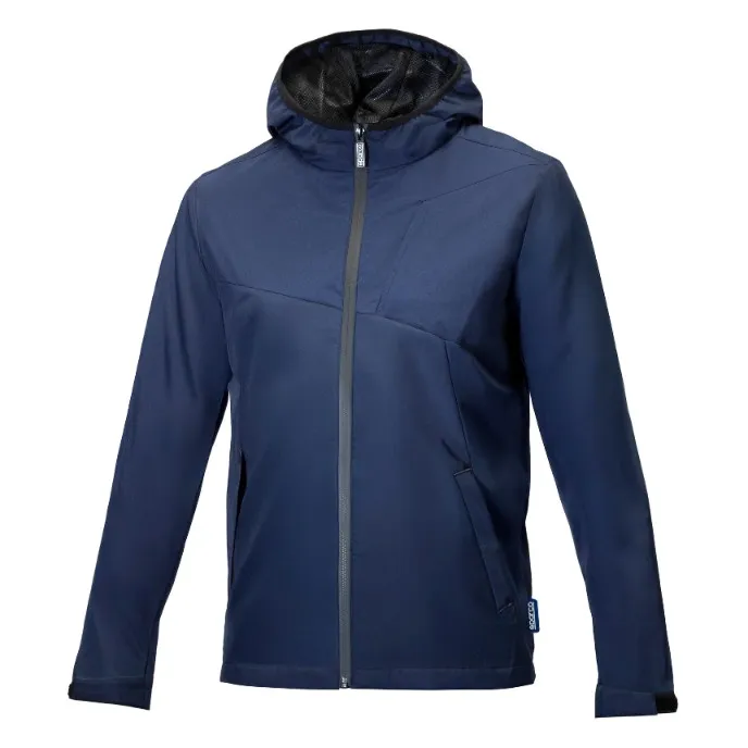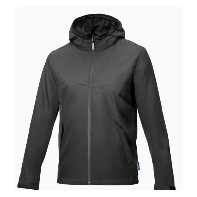 Giacca da lavoro impermeabile con cappuccio Windbreaker Elbert firmata Sparco, dotata di  Fodera interna in mesh, l' esterno è realizzato in mechanical plain stretchcon membrana in TPU, water proof e traspirante, realizzato interamente in Poliestere con grammatura di 110 gr.