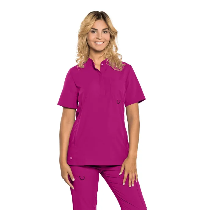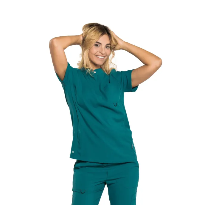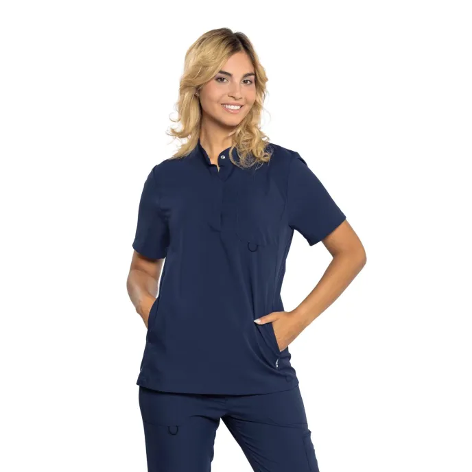 Casacca da Donna a maniche Corte Dr.Blue Lesly firmata Siggi, dotata di chiusura nascosta con bottoni a pressione, pieghe a soffietto sulla schiena, asola elastica multifunzione, tasche laterali, realizzata in interamente in tessuto Poliestere con grammatura di 110 gr.