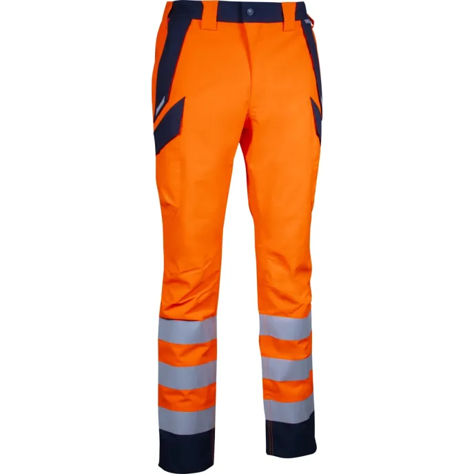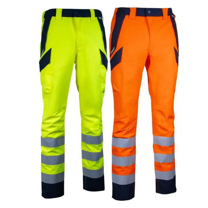 Pantaloni da lavoro alta visibilità multitasche imperemabili Stretch Alumbres firmati Cofra, dotati di cuciture termonastrate, 2 ampie tasche anteriori chiuse con zip e pattina, tasche laterali chiuse da pattina, 2 tasche posteriori chiuse da pattina, elastico in vita, tessuto elastico altamente traspirante, morbida fodera interna con funzione di proteggere la membrana, bande ed inserti reflex termosaldati. Normative: EN ISO 20471.