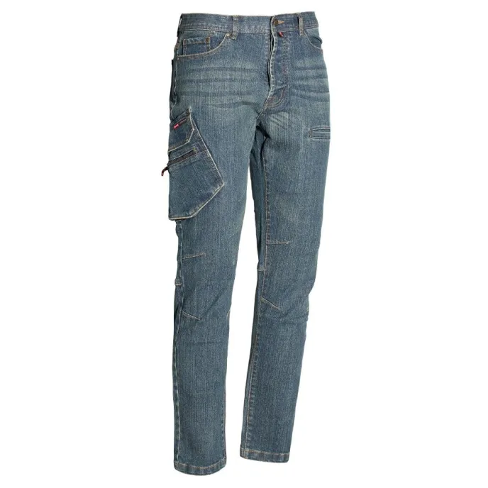Questo jeans da lavoro firmato Issa Line, è un pantalone multistagione, in cotone e poliestere elasticizzati, leggero e traspirante. Si tratta di un jeans con trattamento stone washed, con svariate tasche funzionali e comode, due frontali, due posteriori, una porta-cellulare, due scomparti con patta e zip, chiusura centrale con zip e bottone.