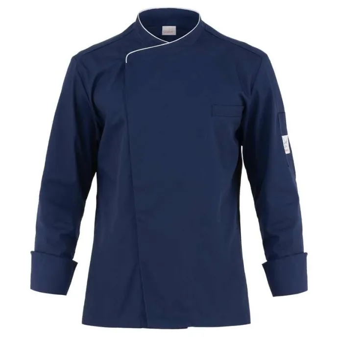 Giacca da lavoro da cuoco Patrizio firmata Giblor's, dotata di collo alla francese, abbottonatura nascosta, il taschino sul petto e il portapenne, inoltre sia nel collo che nei polsi è inserito il classico piping, dotata di Vestibilità Slim Fit.