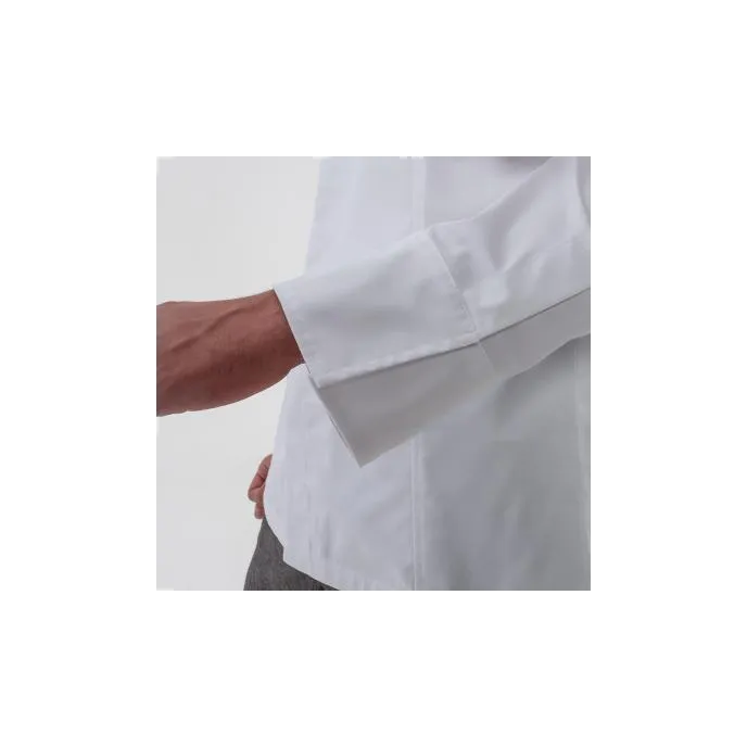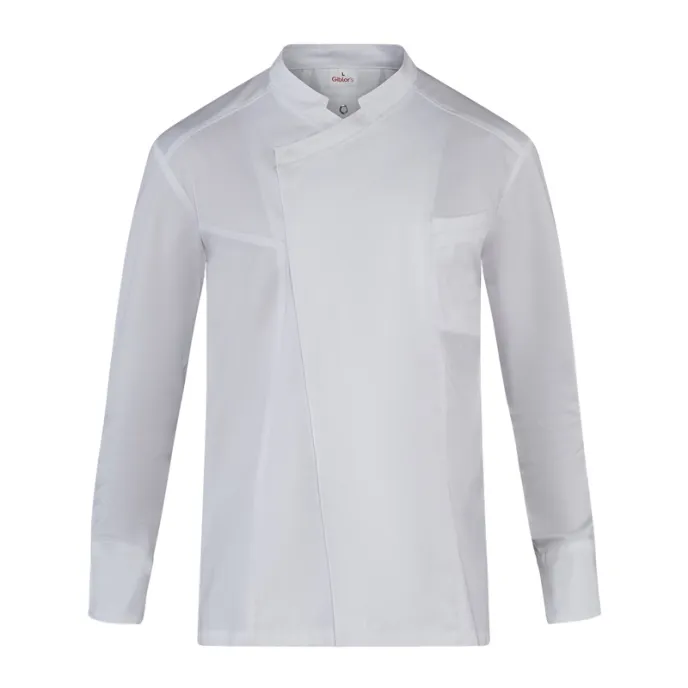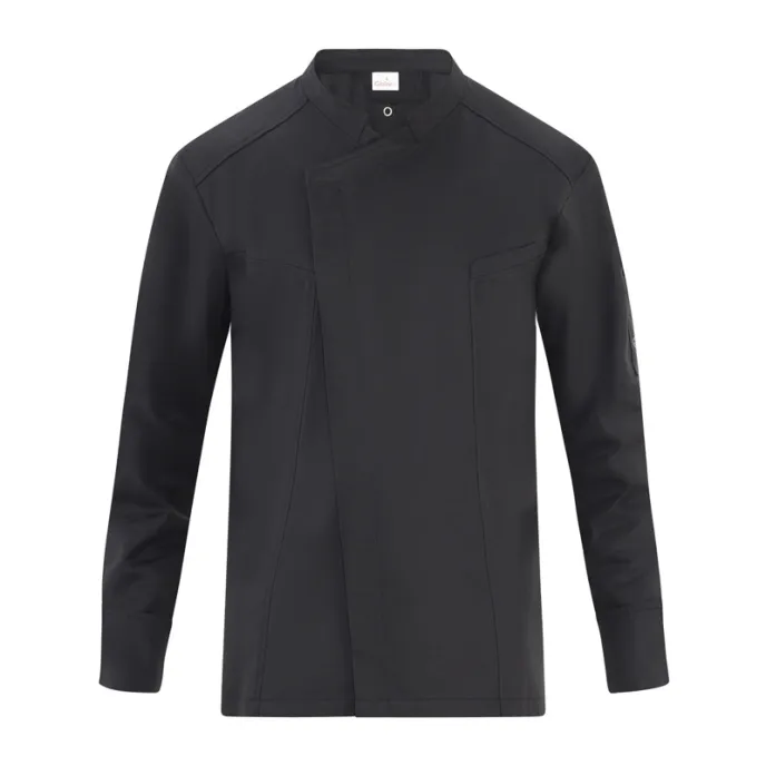 La giacca Edwin, con il suo stile eclettico, rappresenta una nuova proposta della collezione Giblor’s “Elegance” di alta gamma. È realizzata in TencelTM elasticizzato bianco brillante di nuova generazione, di alta qualità e dalle alte performance. Ha un’armatura gabardina poco visibile per via dell’elastan ed è resistente alle alte temperature. Dal gusto contemporaneo, la giacca Edwin presenta un collo frutto di un connubio stilistico fra coreano e francese. Ha un’abbottonatura nascosta doppio petto, con cinque automatici e presenta un motivo a taglio sagomato sulla parte anteriore e posteriore che assicura una vestibilità aderente. Presenta un taschino lato cuore mentre il portapenne è posizionato sulla manica ed è logato con il ricamo G’. Il fondo manica è caratterizzato da polsini stile camicia, chiusi con un bottone automatico nascosto. Nella parte posteriore del collo presenta un’asola che serve ad inserire e fissare il laccio del grembiule ed interamente ribattuta da un’impuntura a piedino che ne rimarca il taglio. La giacca è proposta nelle eleganti varianti bianco e nero
