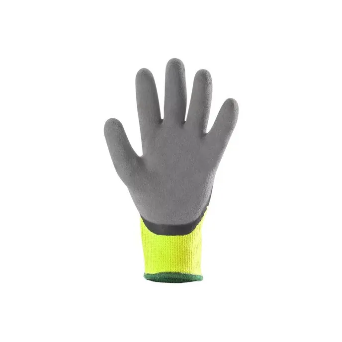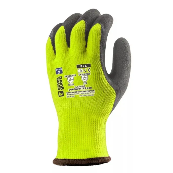 Il guanto di protezione Eurowinter 1LAFO di Coverguard è un dispositivo di sicurezza specificamente progettato per offrire protezione contro il freddo e garantire prestazioni elevate in ambienti a bassa temperatura. Questo modello si distingue per il suo supporto in maglia di acrilico senza cuciture calibro dieci, che assicura comfort termico grazie alla lavorazione in boucletta interna. La struttura è caratterizzata da una doppia spalmatura in lattice sul palmo che combina uno strato liscio con una finitura in schiuma dall'effetto granulato, offrendo un eccellente grip anche in presenza di umidità. La forma ergonomica e il polsino elastico in maglia permettono un'ottima destrezza e flessibilità durante l'uso, mantenendo al contempo la traspirabilità necessaria per il benessere della mano. Il guanto è realizzato in colore giallo fluo per garantire un'alta visibilità all'operatore in diverse condizioni di luce. Certificato come dispositivo di protezione individuale di categoria due, risponde alle normative EN420 per i requisiti generali, EN388 per la protezione contro i rischi meccanici e EN511 per la resistenza al freddo. Grazie a queste caratteristiche tecniche, risulta ideale per settori quali l'edilizia, le infrastrutture, i lavori pubblici, la logistica e la manutenzione, trovando impiego ottimale in attività di movimentazione media e pesante o stoccaggio in ambienti freddi.