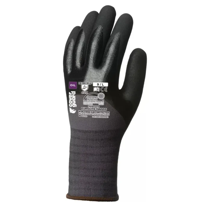 Il guanto di protezione Eurolite 1NIBG di Coverguard è un dispositivo professionale progettato per offrire un grip eccezionale in ambienti oleosi e grassi. La sua struttura ergonomica è realizzata con una maglia grigia senza cuciture a base di poliammide ed elastan calibro 15, che assicura un comfort ottimale e una sensazione di seconda pelle. Il guanto presenta una doppia spalmatura a tre quarti in nitrile nero con una finitura granulata sul palmo per massimizzare la presa e proteggere la pelle dal rischio di dermatiti. Certificato OEKO-TEX STANDARD 100, il prodotto garantisce l'assenza di sostanze nocive ed è dotato di un polsino elastico in tricot per una vestibilità sicura. Classificato come DPI di categoria II, risponde alle normative EN ISO 21420:2020 e EN388:2016 con livelli di prestazione 4.1.2.1.X. Risulta ideale per lavori di precisione, manipolazione di pezzi meccanici oliati, assemblaggio e manutenzione generale nei settori dell'industria leggera, dei trasporti e dell'energia.