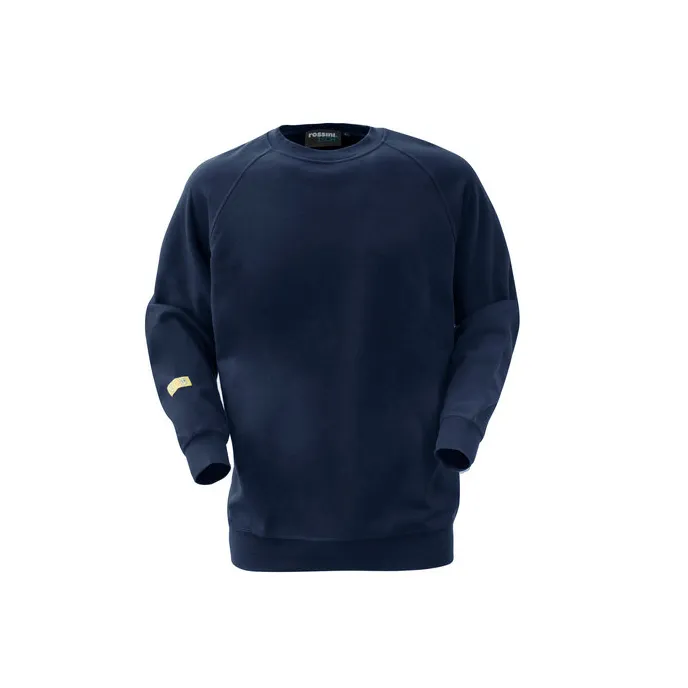La Felpa da lavoro Multinorma , firmata Rossini, composta 60% modacrilico 39% cotone 1% carbonio Peso 300 g/m². Un  Capo con fibra di carbonio progettato per dissipare le cariche elettrostatiche e garantire la massima sicurezza in ambienti ATEX. Rinforzo sulla parte posteriore del collo con fascia parasudore interna, manica raglan. Polsi, collo e fascia girovita in maglia elastica a costine, etichetta jacquard con pittogrammi, travette di rinforzo.