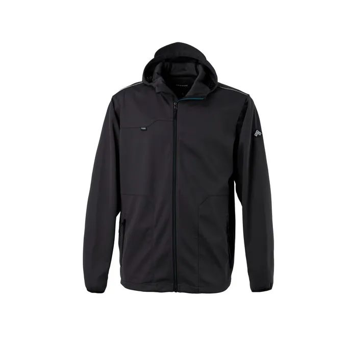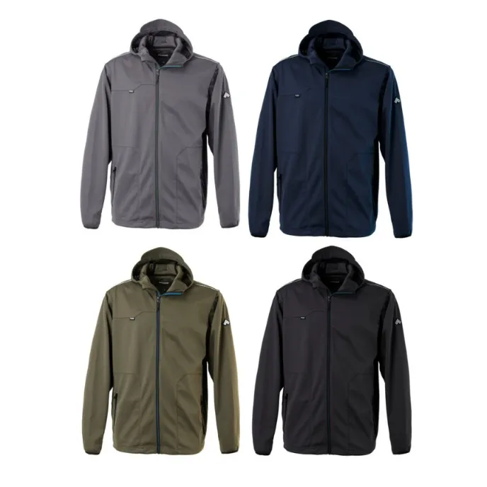 Giubbotto da lavoro Stretch Softshell Multitasche Rainold firmato Rossini, dotato di tessuto Softshell elasticizzato, antivento impermeabile e traspirante, laminato a tre strati con membrana TPU a mesh interna con fibre di carbonio, collo alto e chiusura centrale con zip, cappuccio regolabile con coulisse, ha inoltre due tasche inferiori chiuse con zip.