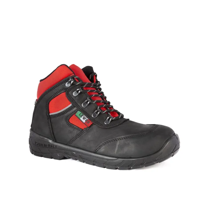 Scarpe antinfortunistiche Alte CR1 firmate Lewer, dotate di tomaia in Pelle fiore idrorepellente, inserti idrorepellenti, fodera AIR PLUS ad alto grado di evaporazione e resistenza all’abrasione, soletta Antibatterica in soffice PU con sistema di ricambio d’aria, puntale Composito 200J, suola Antiperforazione HTC insole perforazione zero. Normative: S3S FO SR