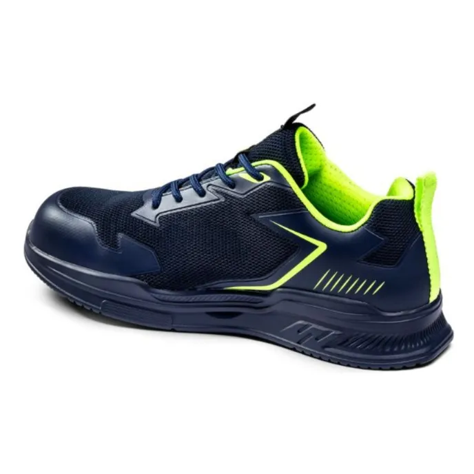 Scarpe Antinfortunistiche basse metalfree Turbo Flinger firmate Sparco, dotate di tomaia in in tessuto traspirante microforato, rinforzi in TPU anti-abrasione, fodera in tessuto 3D microforato traspirante, soletta removibile antistatica in poliuretano a bassa densità con termoformatura ergonomica, soletta antiperforazione superleggera in fibra tessile perforazione-zero, puntale in vetroresina amagnetico, isolante, resistente a 200J, suola antistatica antiscivolo in schiuma di gomma ad elevata ammortizzazione. Normative: S1PS, SR, FO, ESD.
