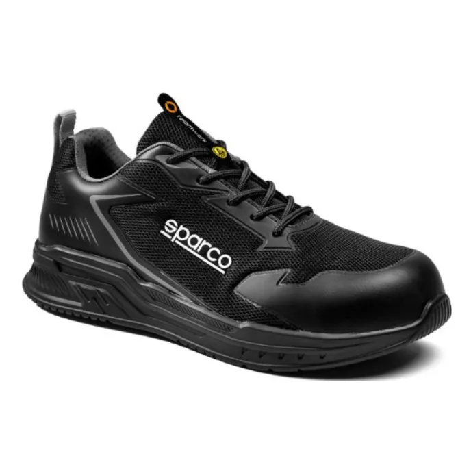 Scarpe Antinfortunistiche basse metalfree Turbo Clamp firmate Sparco, dotate di tomaia in in tessuto traspirante microforato, rinforzi in TPU anti-abrasione, fodera in tessuto 3D microforato traspirante, soletta removibile antistatica in poliuretano a bassa densità con termoformatura ergonomica, soletta antiperforazione superleggera in fibra tessile perforazione-zero, puntale in vetroresina amagnetico, isolante, resistente a 200J, suola antistatica antiscivolo in schiuma di gomma ad elevata ammortizzazione. Normative: S1PS, SR, FO, ESD.