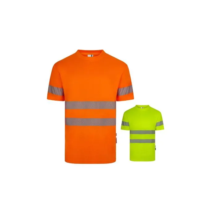 T-shirt con con collo rotondo a coste, dotata di bande rifrangenti segmentate termofissate su torso e maniche e rinforzo in tessuto sulla cucitura del collo. composta 100% poliestere. Peso 140gr.