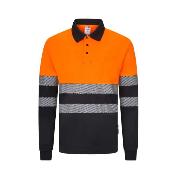 La polo bicolore da lavoro 100% poliestere. Dispone di chiusura centrale con bottoni, colletto a costine, una tasca applicata sul petto, nastri catarinfrangenti segmentati termofissati su busto e maniche. Bottoni, collo, passanti e fondo manica in colore a contrasto.