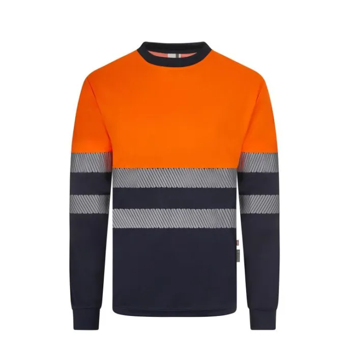 La felpa bicolore da lavoro 100% poliestere. Dispone di chiusura centrale con bottoni, colletto a costine, una tasca applicata sul petto, nastri catarinfrangenti segmentati termofissati su busto. Bottoni, collo, passanti e fondo manica in colore a contrasto.